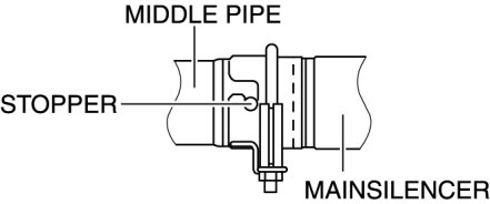 - If the main silencer and middle pipe are reused after being separated once, exhaust gas leakage will occur. When replacing the main silencer or middle pipe, always replace the main silencer and middle pipe at the same time.