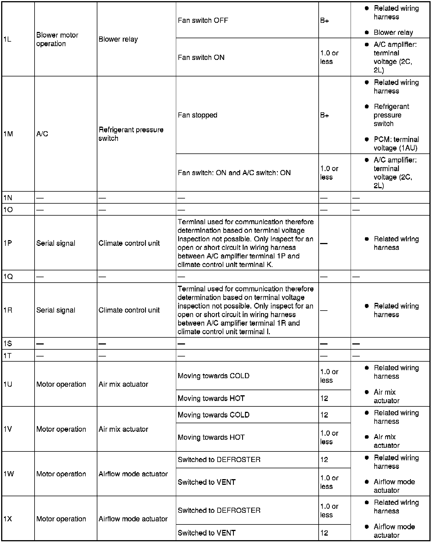 - If the parts under "Inspection item(s)" are found to be normal (except for terminal 1A), replace the A/C amplifier.