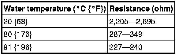 7. Place the detection part of the ECT sensor in water and verify that the resistance between ECT sensor terminals A and B is as indicated in the table while gradually increasing water temperature.