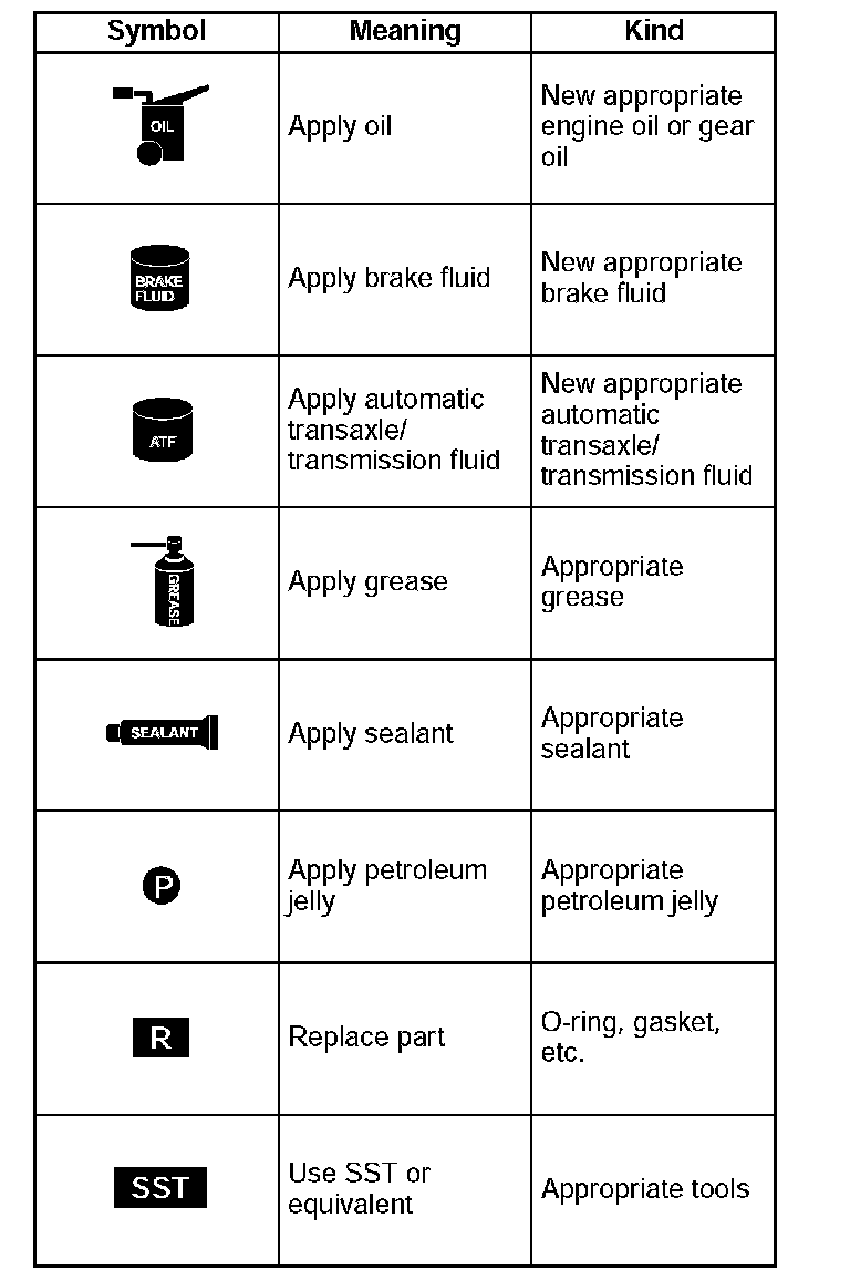 There are eight symbols indicating oil, grease, fluids, sealant, and the use of SST or equivalent. These symbols show application points or use of these materials during service.