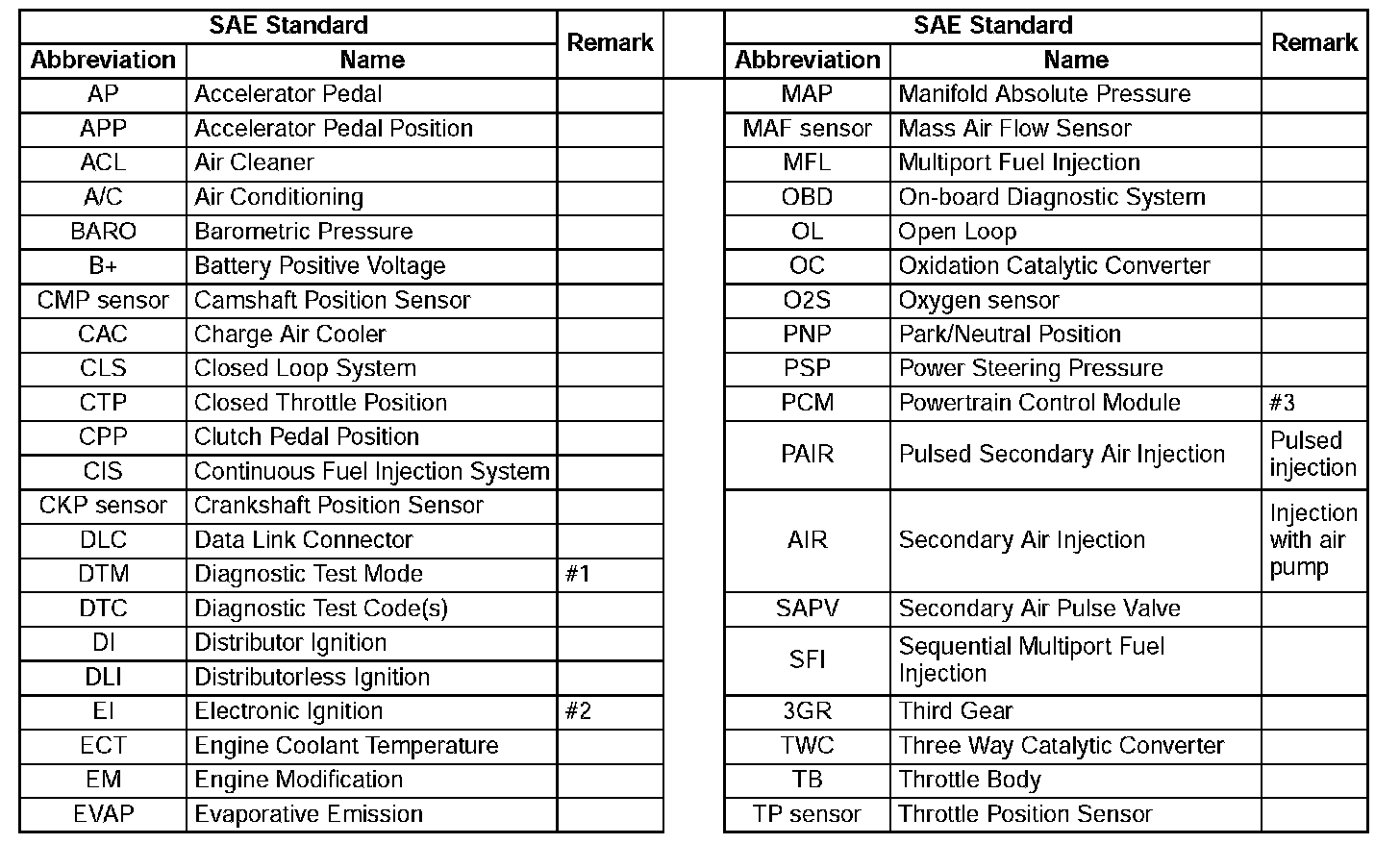 SAE STANDARDS^ In accordance with new regulations, SAE (Society of Automotive Engineers) standard names and abbreviations are now used in this information. The table below lists the names and abbreviations that have been used in Mazda information up to now and their SAE equivalents.