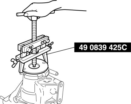 - The drive pinion could be damaged if it falls off. Support the drive pinion with your hand when removing the rear bearing.
