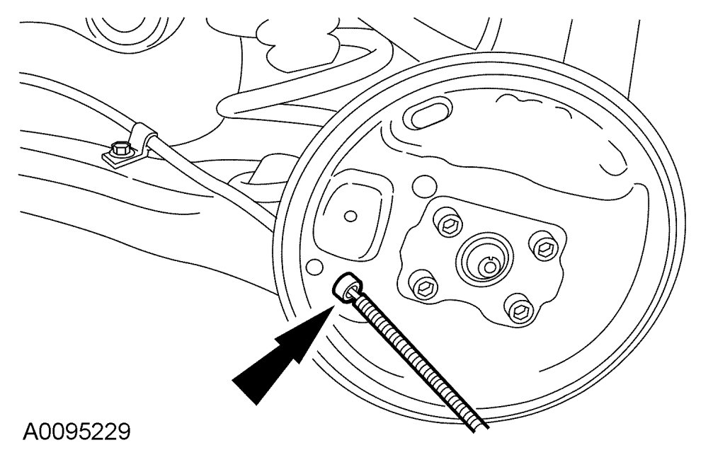 3. Compress the parking brake cable conduit locking tabs and pull the parking brake cable assembly through the backing plate.