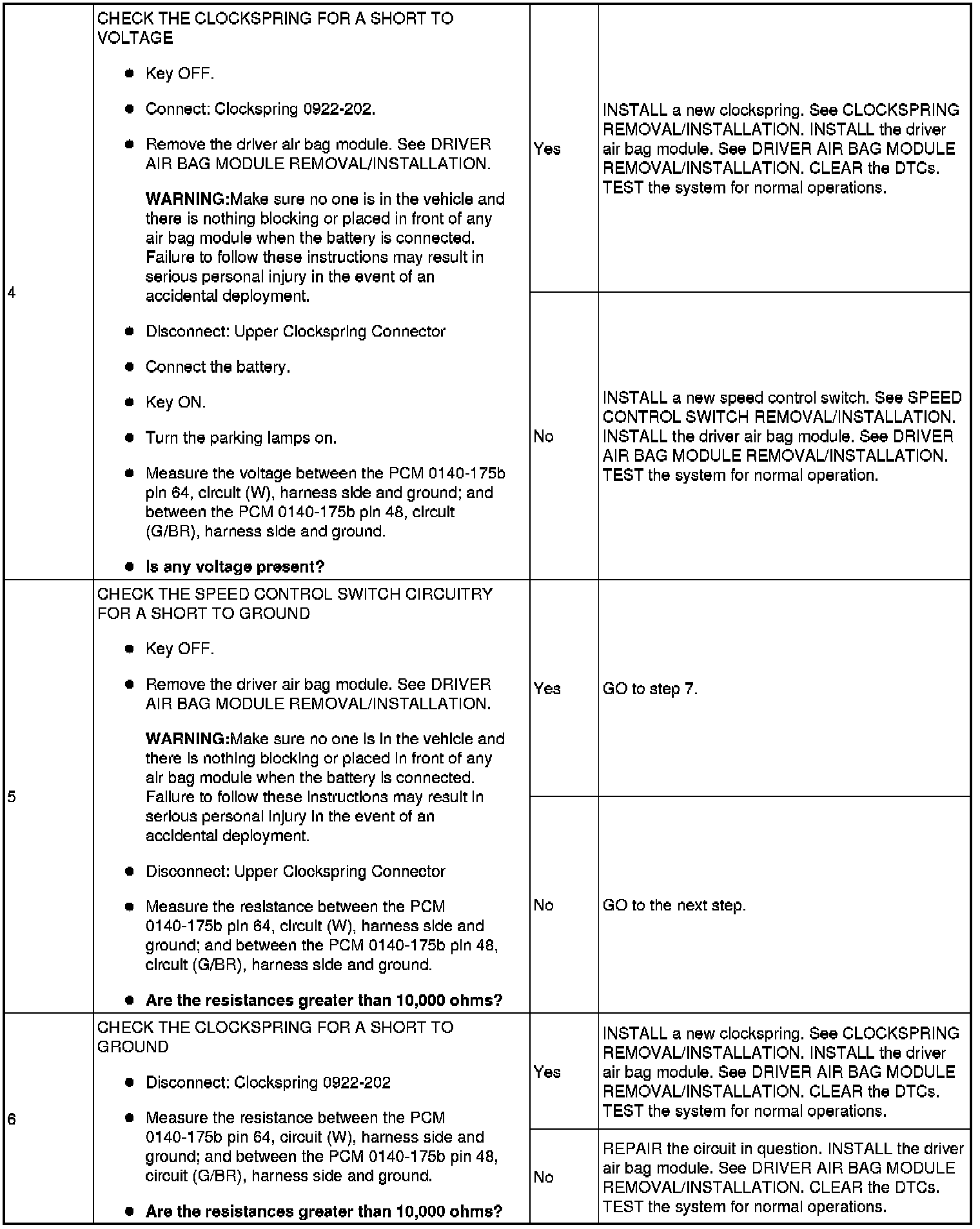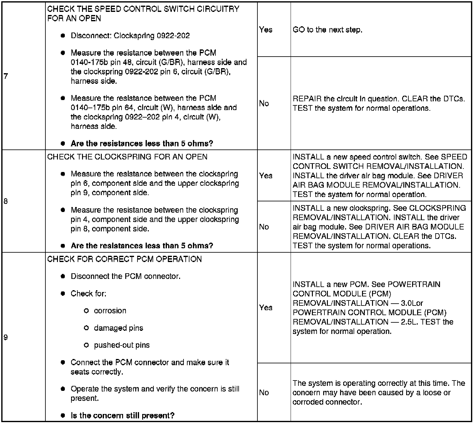 Voltage is sent from the PCM to the speed control switches through circuit VES10 (W). When a switch is pressed, the voltage is routed through a specific resistor value for each function. The PCM grounds the reference voltage through circuit RES08 (G/BR). The PCM uses this reference voltage to determine which speed control input function has been selected.