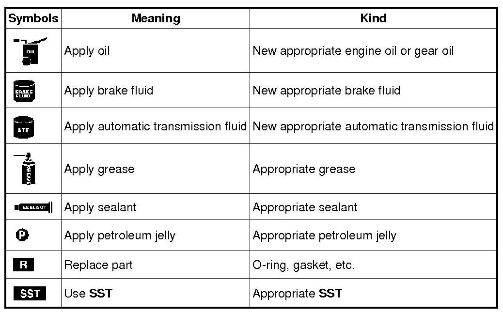 There are 8 symbols indicating oil, grease, fluids, sealant and special service tool (SST) use. These symbols show application points or use of these materials during service.