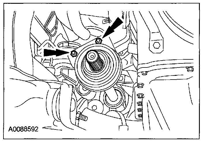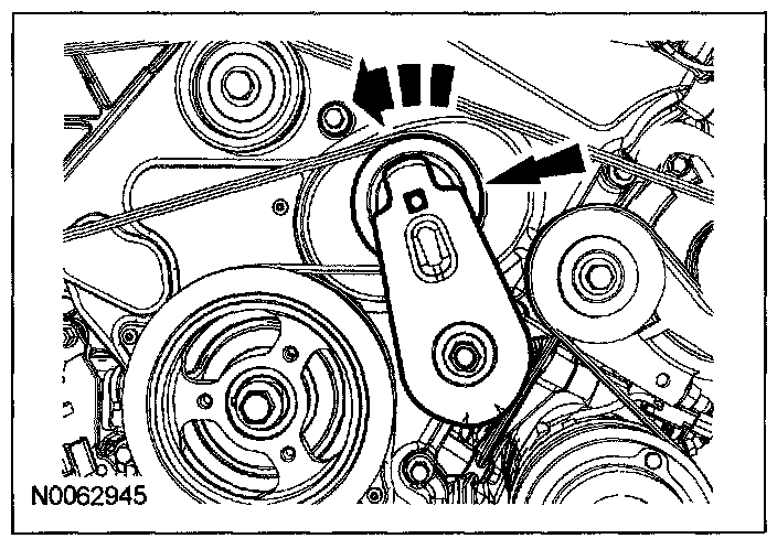 64. Rotate the accessory drive belt tensioner counterclockwise and install the accessory drive belt.
