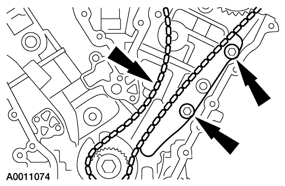 11. Position the RH timing chain and chain guide and install the bolts.