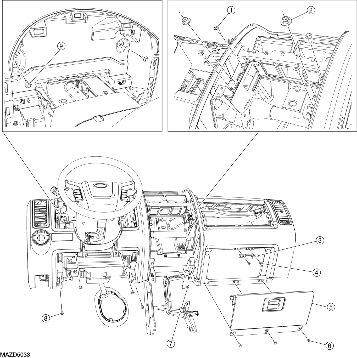 8. Remove the 2 instrument panel trim-to-audio unit bracket nuts.