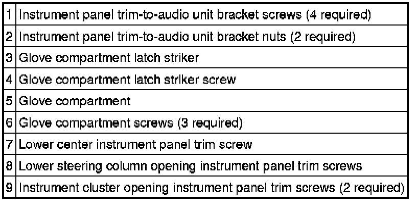 7. Remove the 4 instrument panel trim-to-audio unit bracket screws.