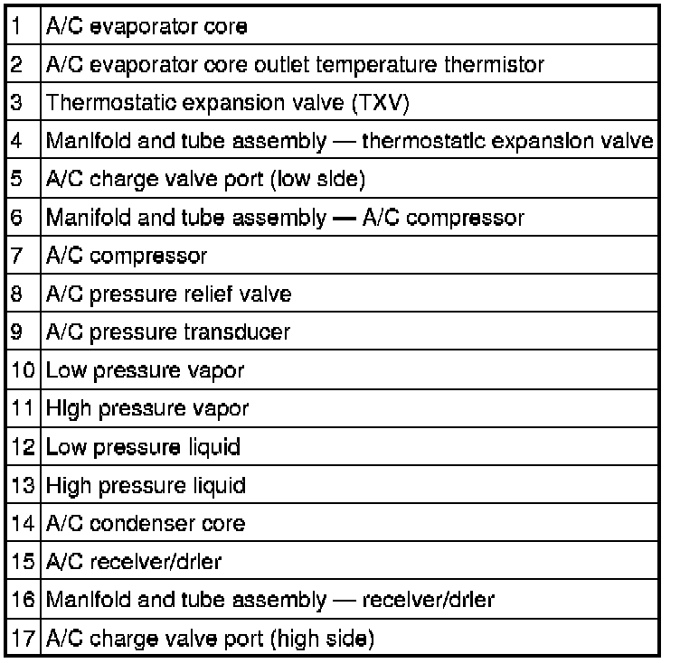 During stabilized conditions (air conditioning system shutdown), the refrigerant is in a vaporized state and pressures are equal throughout the system. When the A/C compressor is in operation it increases pressure on the refrigerant vapor, raising its temperature. The high-pressure and high-temperature vapor is then released into the top of the condenser core.The condenser core, being close to ambient temperature, causes the refrigerant vapor to condense into a liquid when heat is removed from the refrigerant by ambient air passing over the fins and tubing. The now liquid refrigerant, still at high pressure, exits from the bottom of the condenser core and enters the inlet side of the evaporator core orifice.The evaporator core orifice is the restriction in the refrigerant system that creates the low pressure drop in the evaporator core and separates the high and low pressure sides of the A/C system. As the liquid refrigerant leaves this restriction, its pressure and boiling point are reduced.The liquid refrigerant is now at its lowest pressure and temperature. As it passes through the evaporator core, it absorbs heat from the passenger compartment airflow passing over the plate/fin sections of the evaporator core. This addition of heat causes the refrigerant to boil (convert to gas). The now cooler passenger compartment air can no longer support the same humidity level of the warmer air and this excess moisture condenses on the exterior of the evaporator coils and fins and drains outside the vehicle.The suction accumulator is designed to remove moisture from the refrigerant and to prevent any liquid refrigerant that may not have been vaporized in the evaporator core from reaching the A/C compressor. The A/C compressor is designed to pump refrigerant vapor only, as liquid refrigerant will not compress and can damage the A/C compressor.