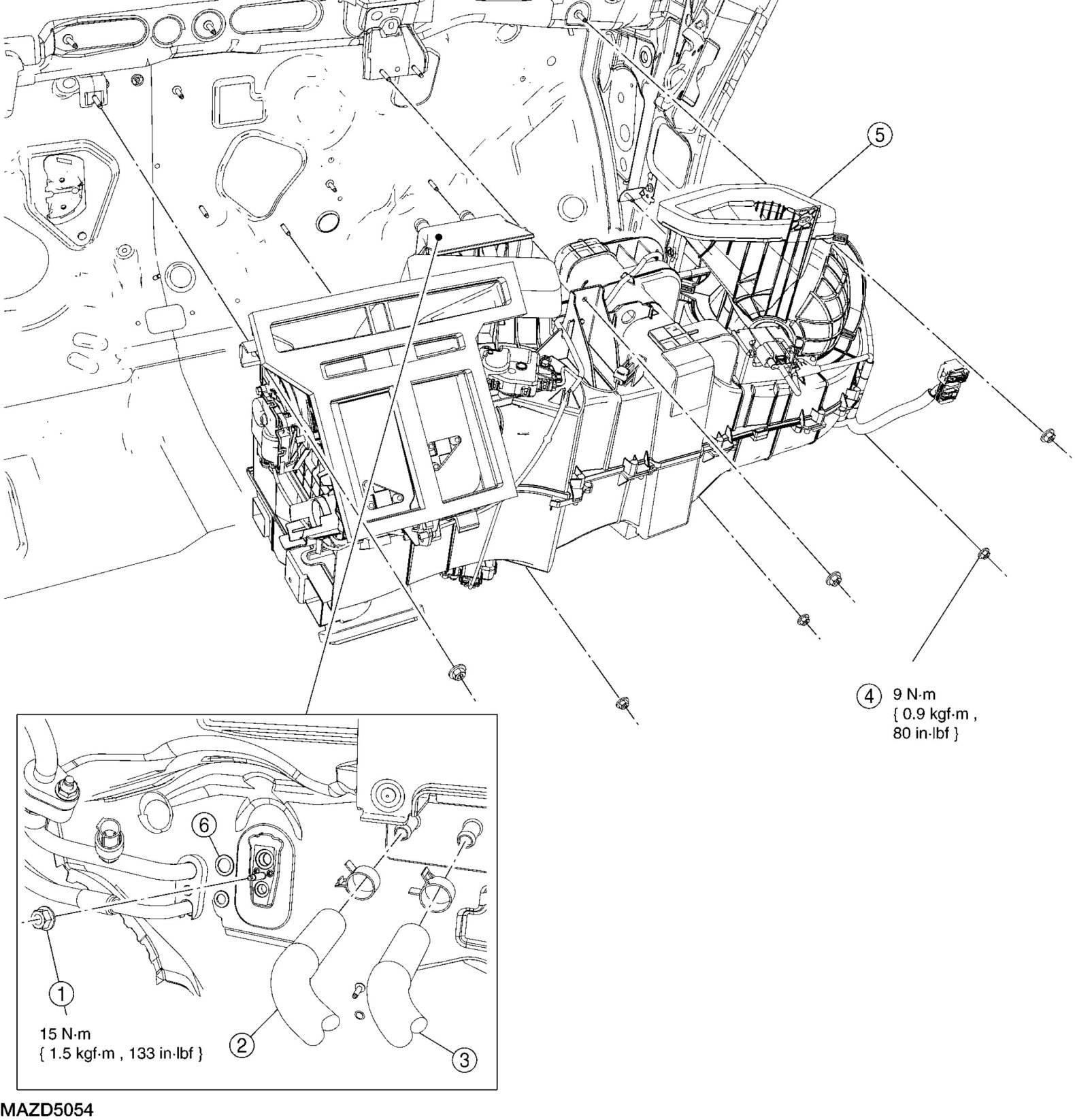 - To install, tighten to 15 Nm {1.5 kgf-m, 133 in-lbf}.