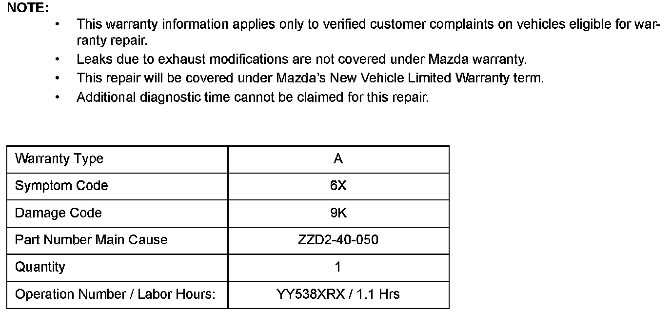 ^ Leaks due to exhaust modifications are not covered under Mazda warranty.