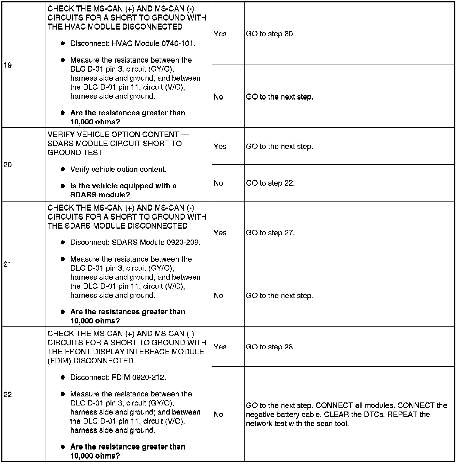The medium speed controller area network (MS-CAN) uses an unshielded twisted pair cable, circuits (GY/O) and (V/O). The smart junction box (SJB), audio control module (ACM), satellite digital audio receiver system (SDARS) module, front display interface module (FDIM), front controls interface module (FCIM), and the HVAC module communicate with the scan tool using the MS-CAN. The instrument cluster (IC), while on the MS-CAN, communicates with the scan tool only on the HS-CAN.