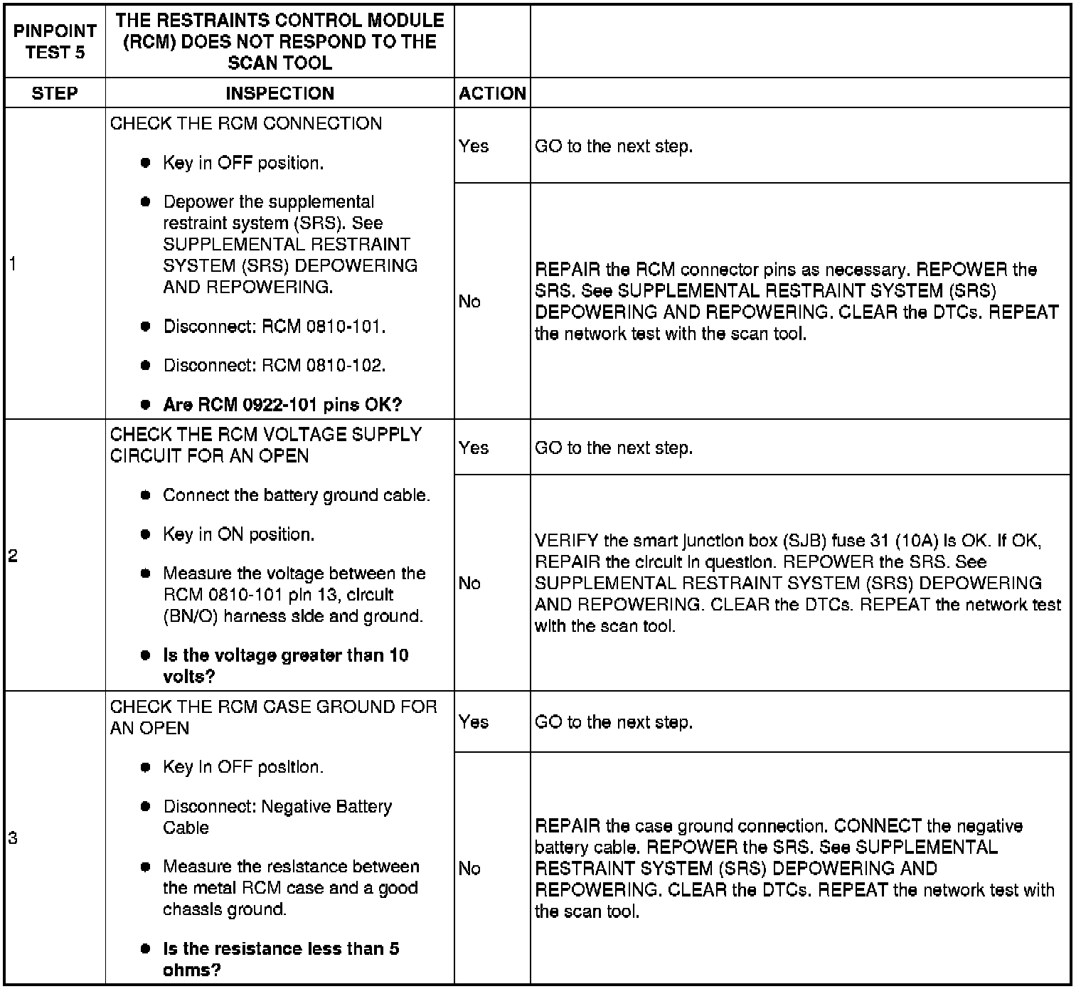 PINPOINT TEST 5: THE RESTRAINTS CONTROL MODULE (RCM) DOES NOT RESPOND TO THE SCAN TOOL