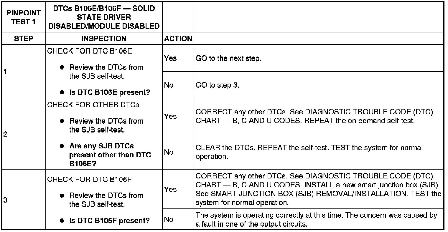 PINPOINT TEST 1: DTCs B106E/B106F - SOLID STATE DRIVER DISABLED/MODULE DISABLED