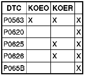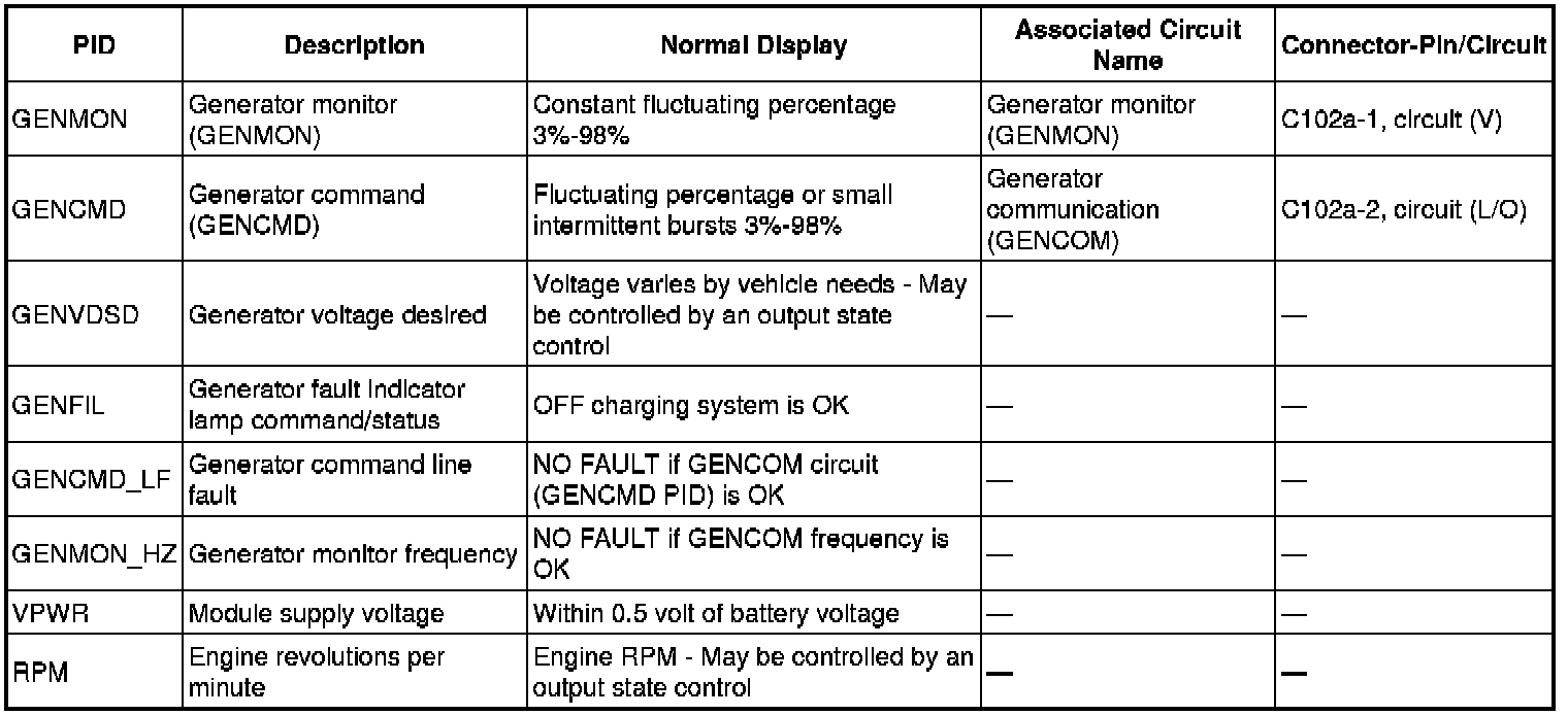 This system uses 2 communication lines between the PCM and the generator/voltage regulator. Both of these communication lines use Pulse-Width Modulation (PWM). The generator communication (GENCOM) line communicates the desired set point from the PCM to the voltage regulator. The generator monitor (GENMON) line communicates the generator load and error conditions to the PCM. The GENCOM command is only sent by the PCM when it is necessary to adjust the voltage set point. If the set point does not need to be changed, several seconds may elapse between PCM GENCOM commands. This normal operation will appear in the PID as occasional "bursts" of pulse-width commands. The third pin on the voltage regulator, the A circuit pin, is a circuit dedicated to monitor or sense battery voltage.The PCM simultaneously controls and monitors the output of the generator. When the current consumption is high or the battery is discharged, the PCM will raise engine speed as needed to increase generator output. The generator charges the battery and at the same time supplies power for all of the electrical loads that are required. The battery is more effectively charged with a higher voltage when the battery is cold and a lower voltage when the battery is warm. The PCM is able to adjust the charging voltage according to the battery temperature by using a signal from the Intake Air Temperature (IAT) sensor. The PCM also uses other inputs to control charging system voltage such as the Vehicle Speed Sensor (VSS) and Engine Coolant Temperature (ECT). This means the voltage set point is calculated by the PCM and communicated to the voltage regulator by the GENCOM circuit based on the needs of the vehicle and the conditions.To minimize engine drag when starting the engine, the PCM does not allow the generator to produce any output until the engine has started. The PCM turns off the generator during cranking to reduce the generator load and improve cranking speed. Once the engine starts, the PCM slowly increases generator output to desired voltage.The PCM controls the charging system warning indicator by sending a message over the High-Speed Controller Area Network (HS-CAN) to the Instrument Cluster (IC) to turn the charging system lamp ON or OFF.The PCM controls the charging system warning indicator by sending a message over the HS-CAN to the IC module. The IC module will then control charging system warning indication based on the message from the PCM. If equipped with a charging system warning indicator, the IC module will turn the indicator ON or OFF. If equipped with a message center, the IC module will display a CHECK CHARGING SYSTEM message. When the ignition is ON and the engine is OFF on vehicles equipped with a message center, the CHECK CHARGING SYSTEM message may not be displayed.Under certain circumstances, the charging system may have a concern, but still keep the battery charged and the vehicle running. GENCOM is normally used to initiate charging, but the generator may charge with a fault in this circuit. If the engine is operated at greater than 2,000 rpm momentarily, the generator may "self-excite" or start charging on its own. The charging system warning indicator is illuminated and/or CHECK CHARGING SYSTEM message is displayed, and the generator operates in a default mode (approximately 13.5 volts) until the engine is turned off. When the engine is restarted and the engine is operated at greater than 2,000 rpm momentarily, the generator may again self-excite and again the charging system warning indicator is illuminated and/or CHECK CHARGING SYSTEM message is displayed.The PIDs and their associated descriptions used in charging system diagnosis are listed below: