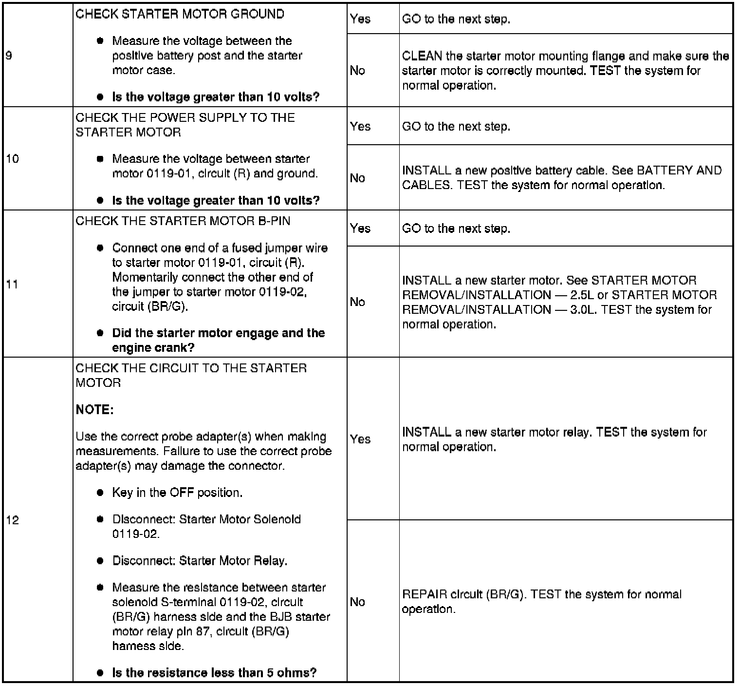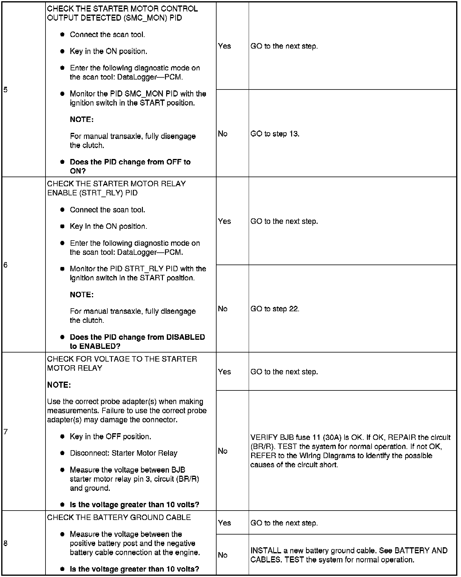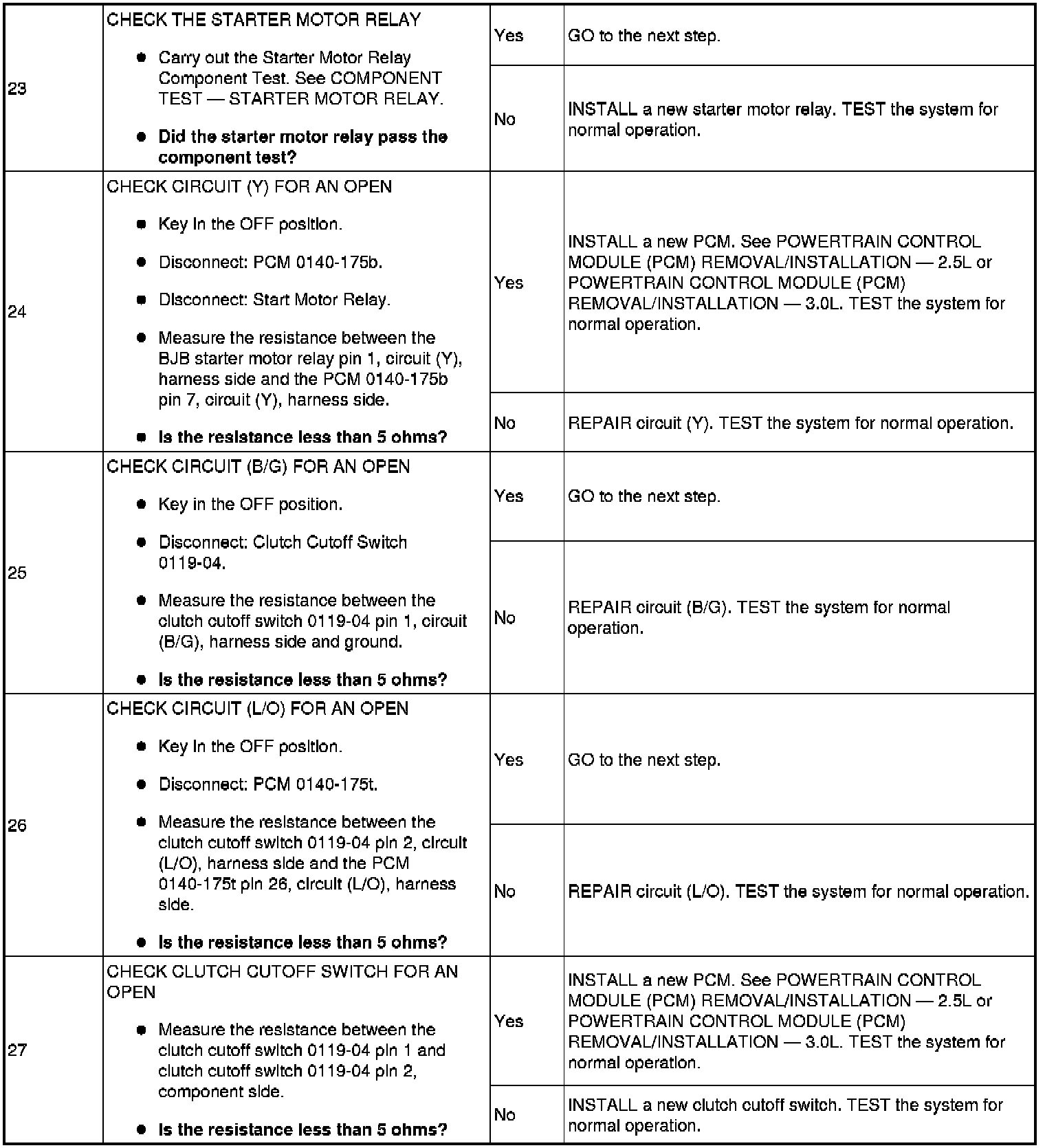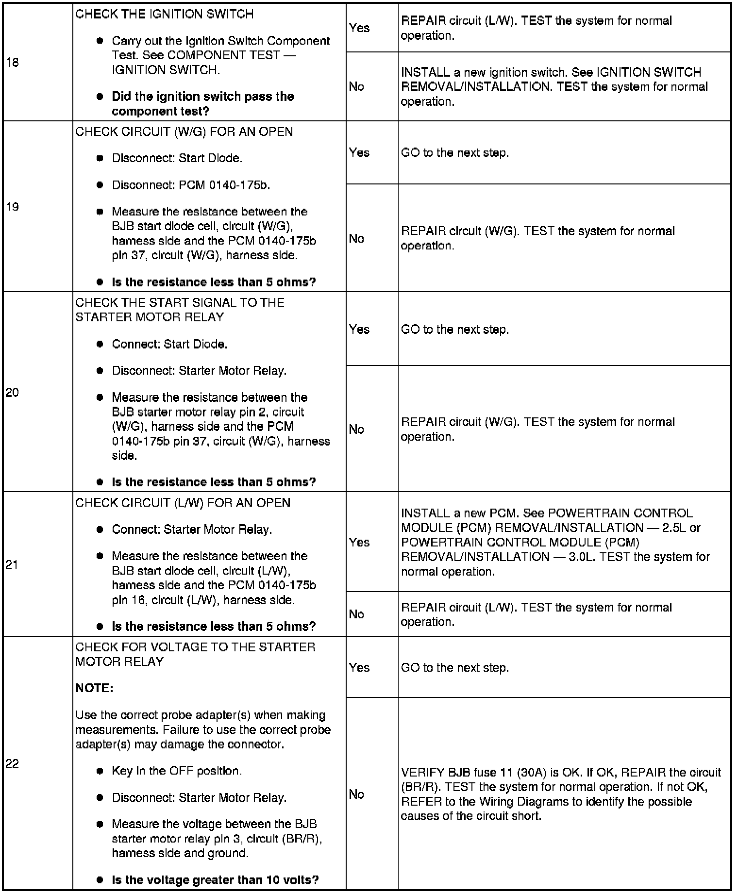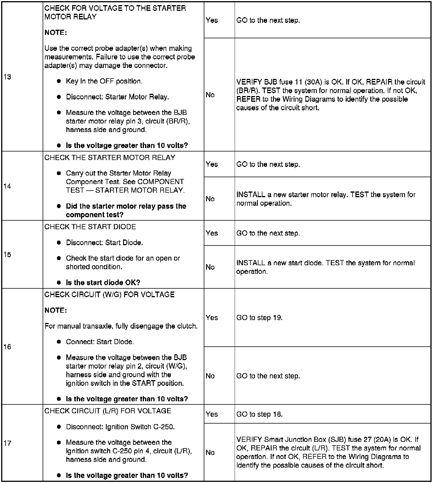 The Battery Junction Box (BJB) supplies constant power to the starter motor relay on circuit (L/R) through fuse 11 (30A). On vehicles with automatic transaxles, when the key is placed in the START position with the vehicle in PARK or NEUTRAL, the Transmission Range (TR) sensor sends a signal to the PCM and provides ground to the starter motor relay. On vehicles with manual transaxles, when the key is placed in the START position with the clutch pedal depressed, the clutch cutoff switch sends a signal to the PCM and provides ground to the starter motor relay. This allows power to be supplied from the starter motor relay contacts which then flows through circuit (BR/G) to the starter solenoid. The solenoid is grounded at the starter motor. Energizing the starter solenoid will engage the starter drive into the ring gear and closes the solenoid contacts, allowing power directly from the battery through circuit (R) to the starter motor to start the engine.