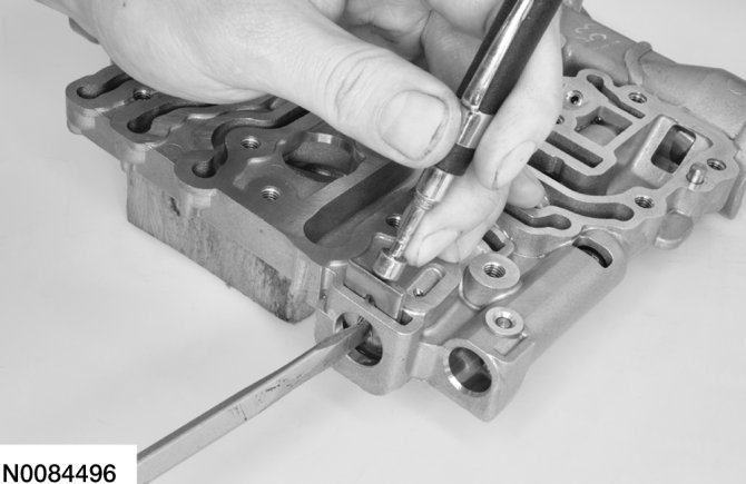 13. Compress the TCC control valve spring with a screwdriver and remover the retainer with a magnet.