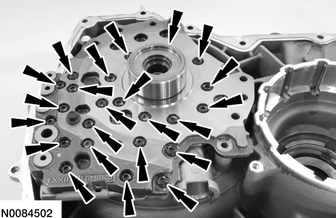 7. Remove the 2 bolts and the pump assembly from the torque converter housing.