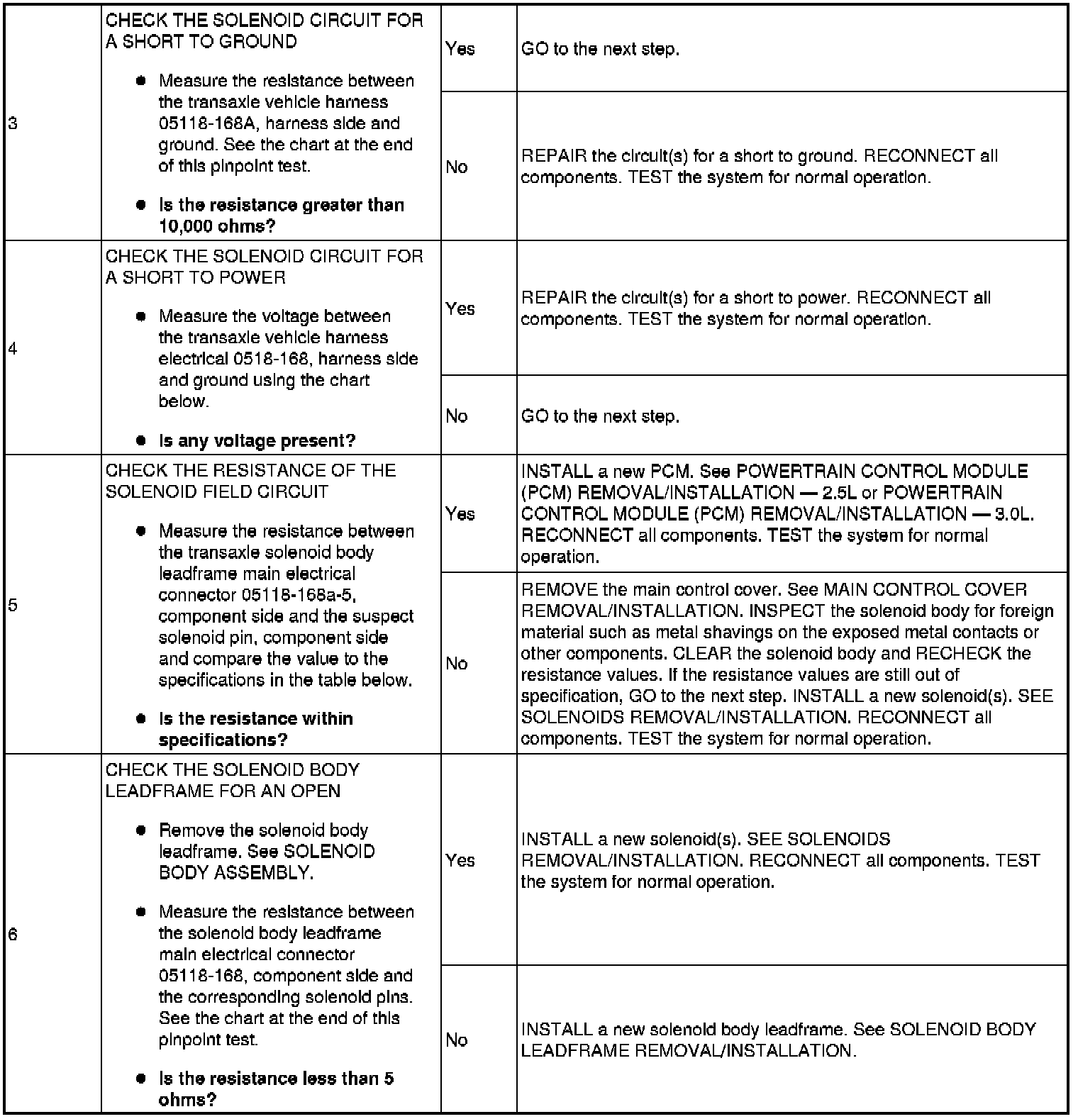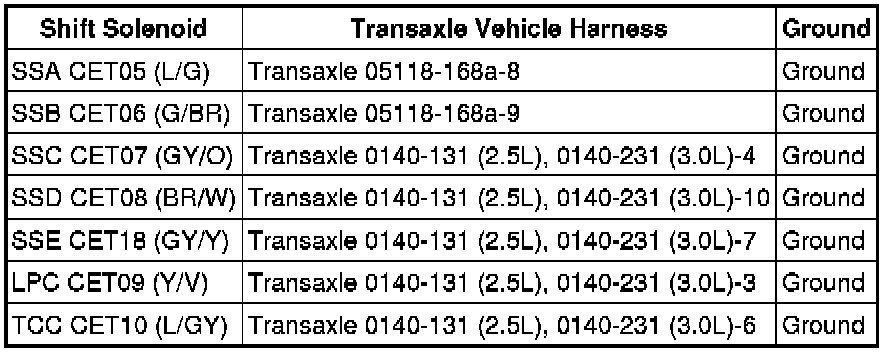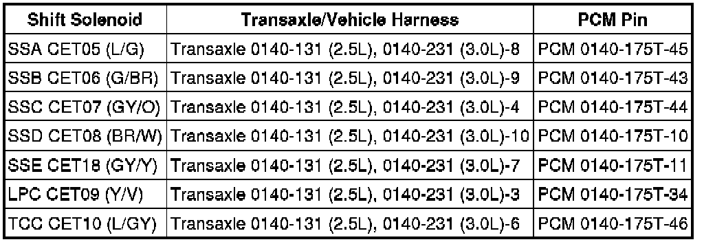 Solenoid Resistance Values: SSA, SSB, SSC, SSD, SSE, TCC and LPC (ON/OFF)