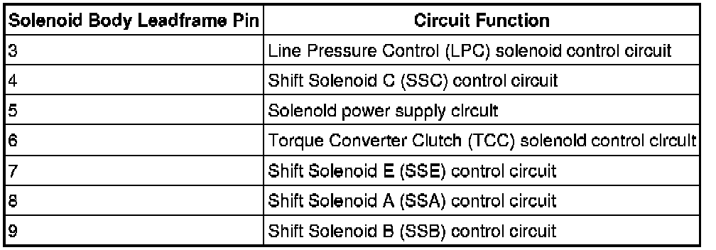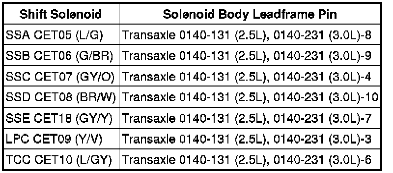 NOTE:Refer to the transaxle connector illustrations and solenoid body leadframe internal wiring diagram preceding these pinpoint tests. See [1][2]Automatic Transmission/Transaxle.
