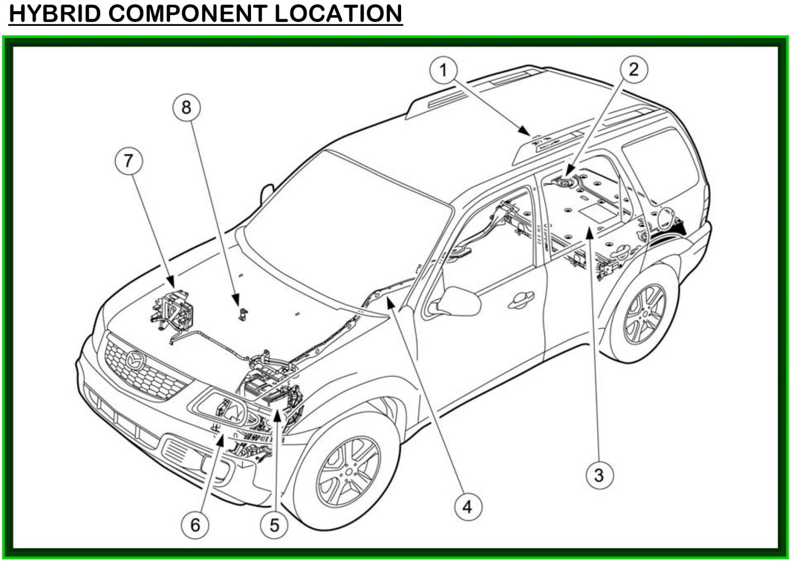 HYBRID COMPONENT LOCATION AND IDENTIFICATIONThis chart provides the location, description and basic function of the hybrid system components. Refer to the component location illustration.