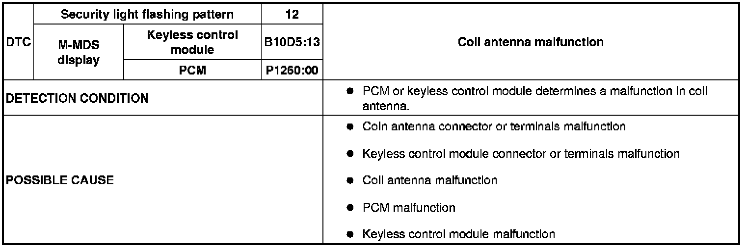 SECURITY LIGHT: 12, DTC: B10D5:13/P1260:00 [IMMOBILIZER SYSTEM (ADVANCED KEYLESS ENTRY AND PUSH BUTTON START SYSTEM)]