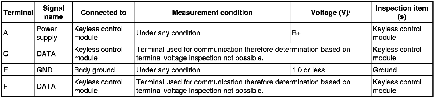 - If the voltages cannot be verified as indicated in the terminal voltage table, inspect the parts under "Inspection item (s)".