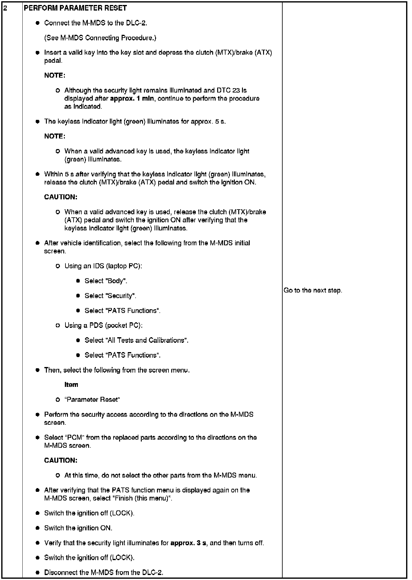 - When replacing the keyless control module or the steering lock unit, remove the valid keys and the valid advanced keys from the vehicle (keep them 1 m or more from the vehicle) and switch the ignition ON according to the directions on the M-MDS screen. Select, "There is no programmed ignition key and programmed advanced key" from the M-MDS screen.