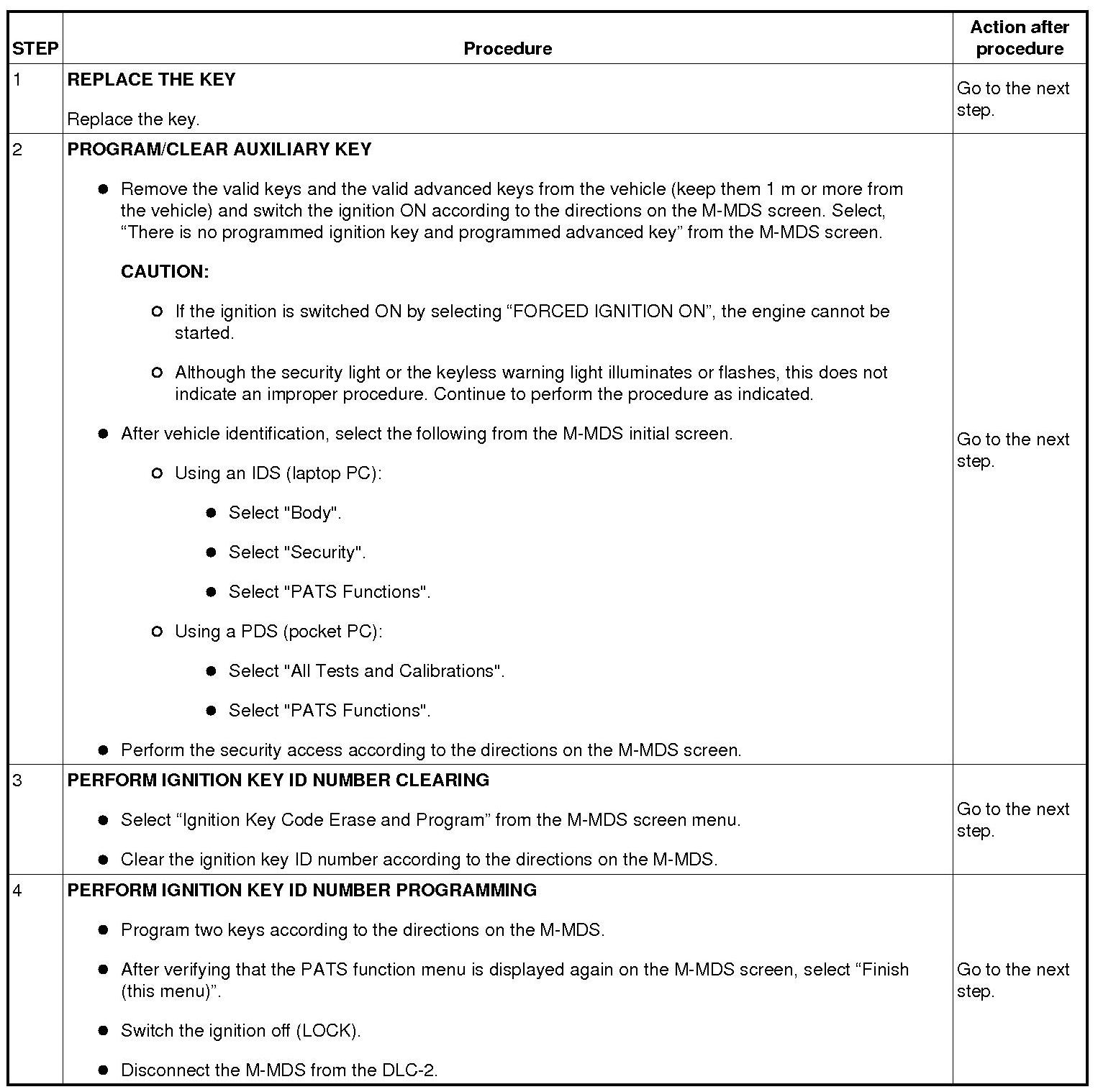 Immobilizer System-Related Parts Service and Programming Procedure Table
