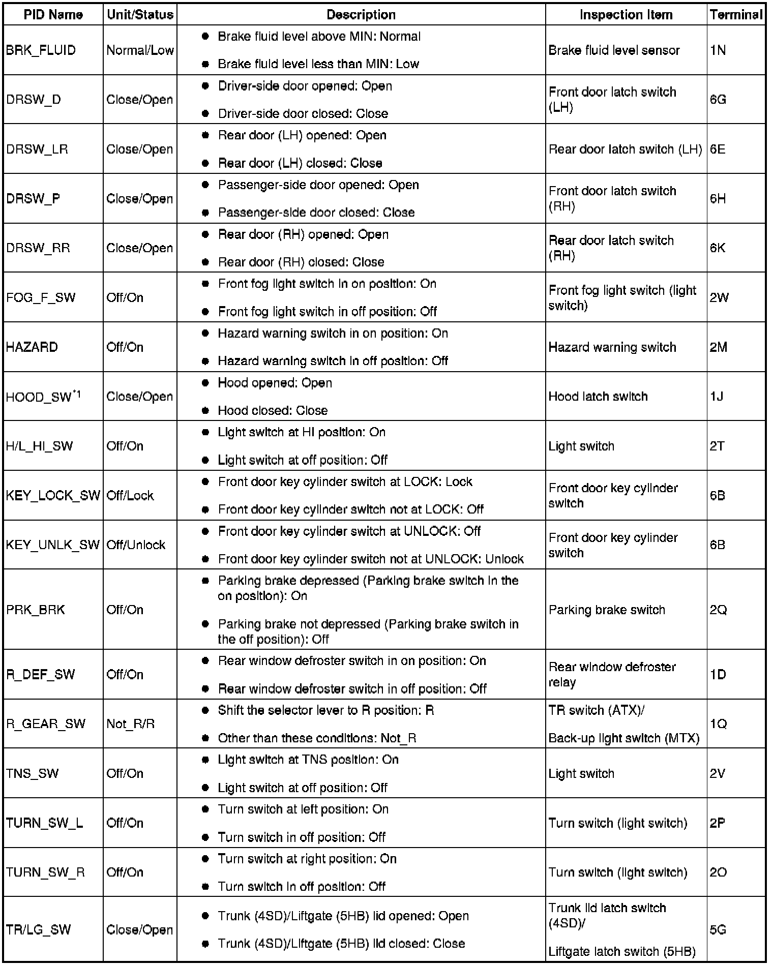 PID/DATA Monitor Table (Part 1):