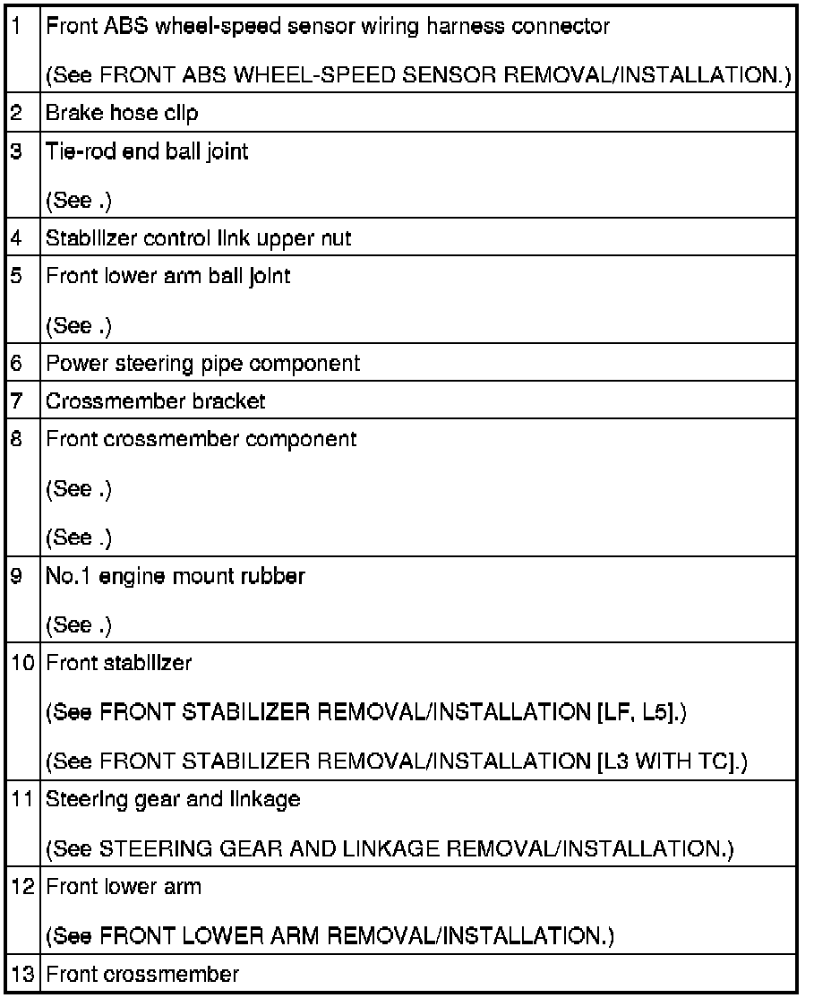 3. Remove the front crossmember, front stabilizer, front lower arm, and steering gear and linkage as a single unit.
