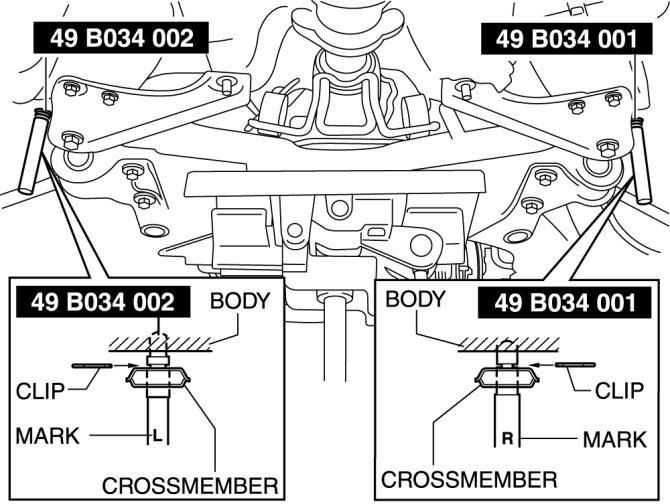1. Verify the left and right identification marks and install the positioning SST to the front crossmember.