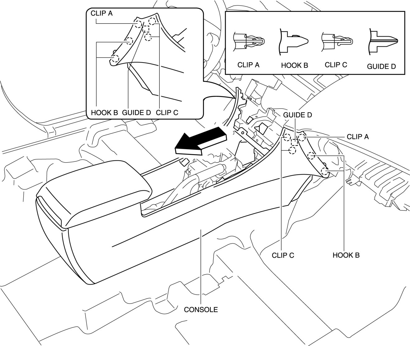 5. Pull the console in the direction of the arrow shown in the figure, then detaching clips A, C hooks B and guides D.