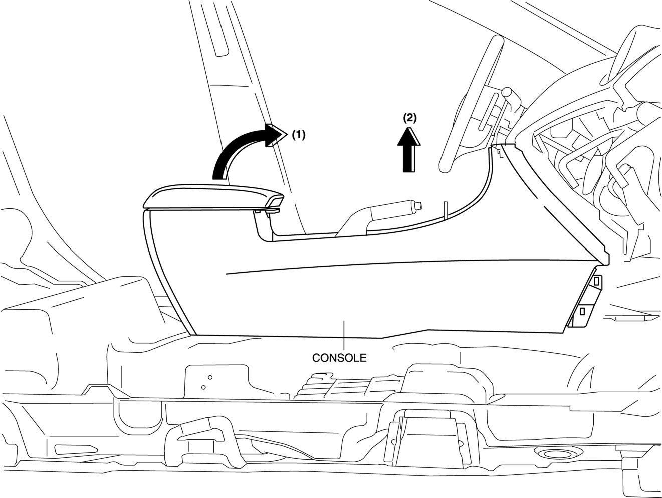 6. Pull up the console in the direction of the arrow (1) shown in the figure, move the rear console in the direction of the arrow (2), and remove it avoiding the parking brake lever.