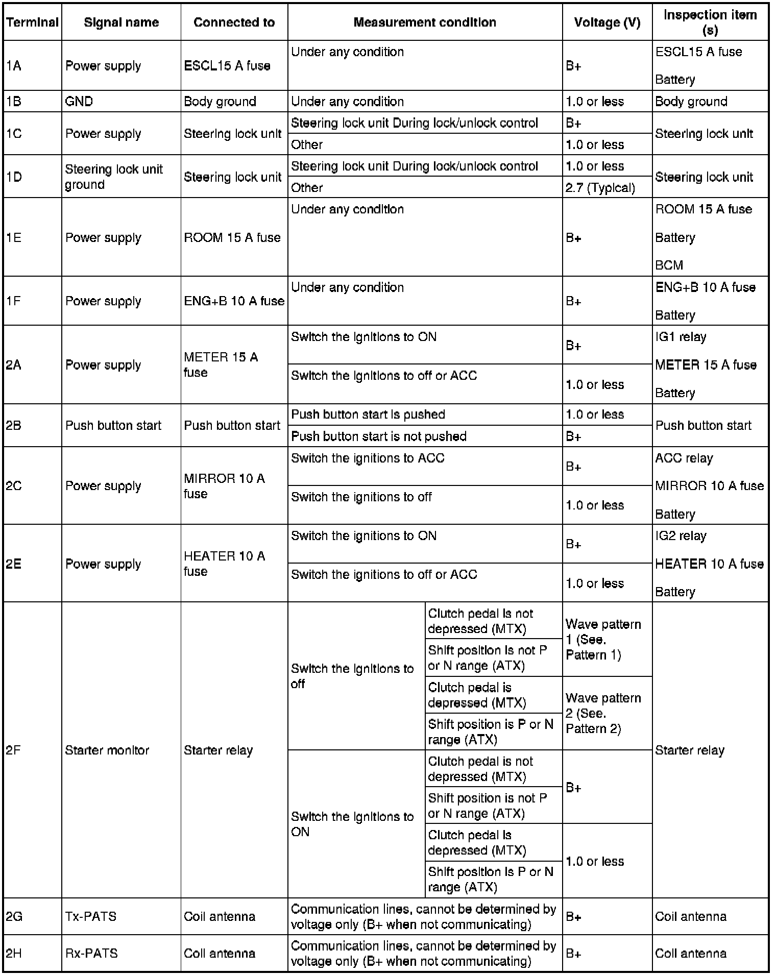 - Starter relay: 2F (+) and body ground (-)