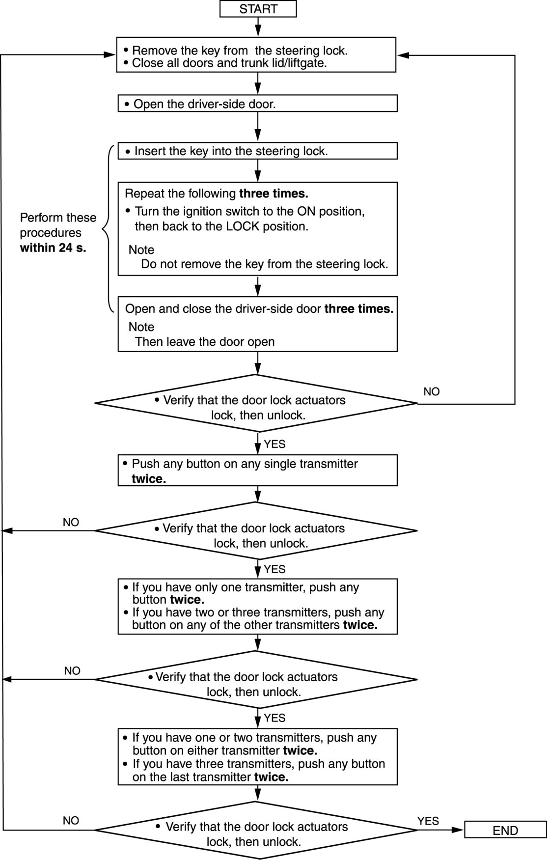 - After completing the work, remove the key from the steering lock and verify that all the door lock/unlock operation using the transmitter is correct.