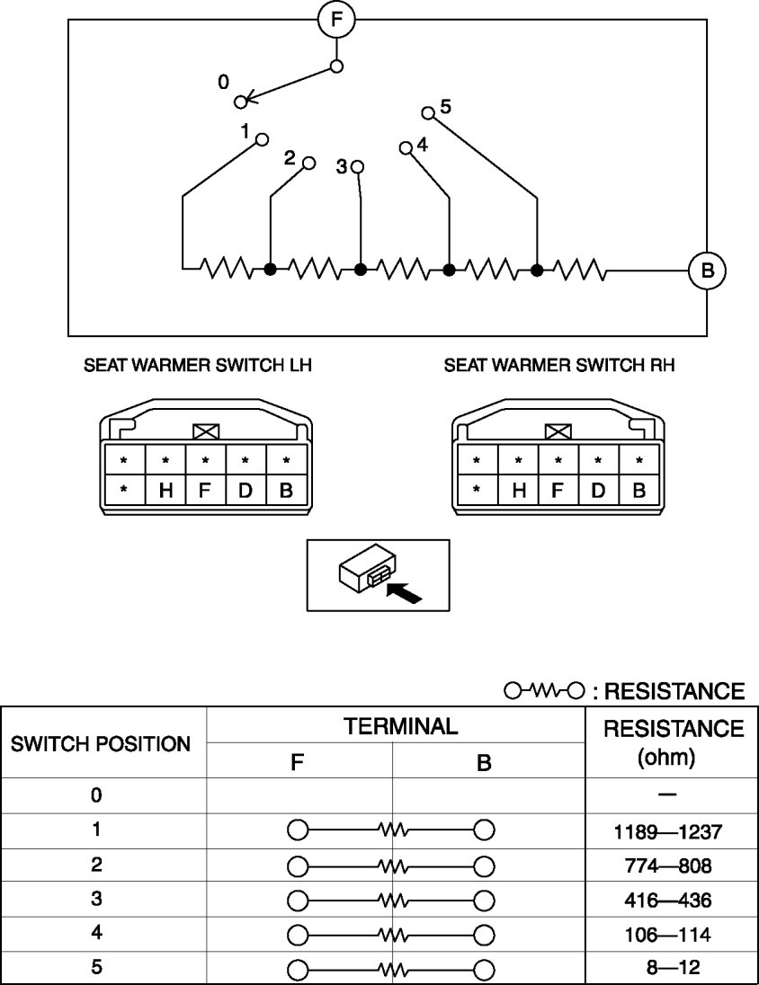 Inspect for resistance and continuity between the seat warmer switch terminals using a tester.
