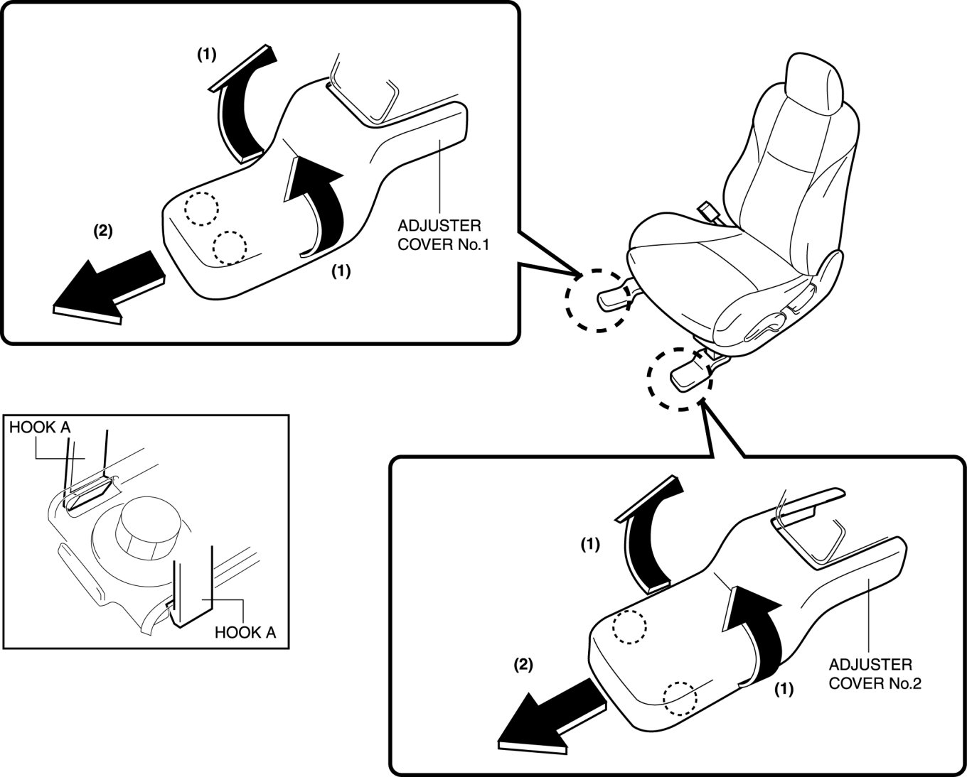 4. Detach hook A while pulling the adjuster cover No.1 and No.2 in the direction of the arrow (1), and remove it in the direction of arrow (2) shown in the figure.