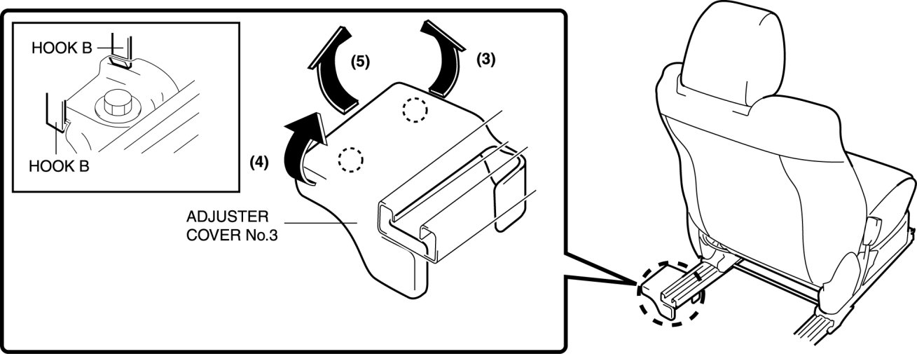 5. Detach hook B while pulling the adjuster cover No.3 in the direction of the arrow (3), (4) and remove it in the direction of arrow (5) shown in the figure.