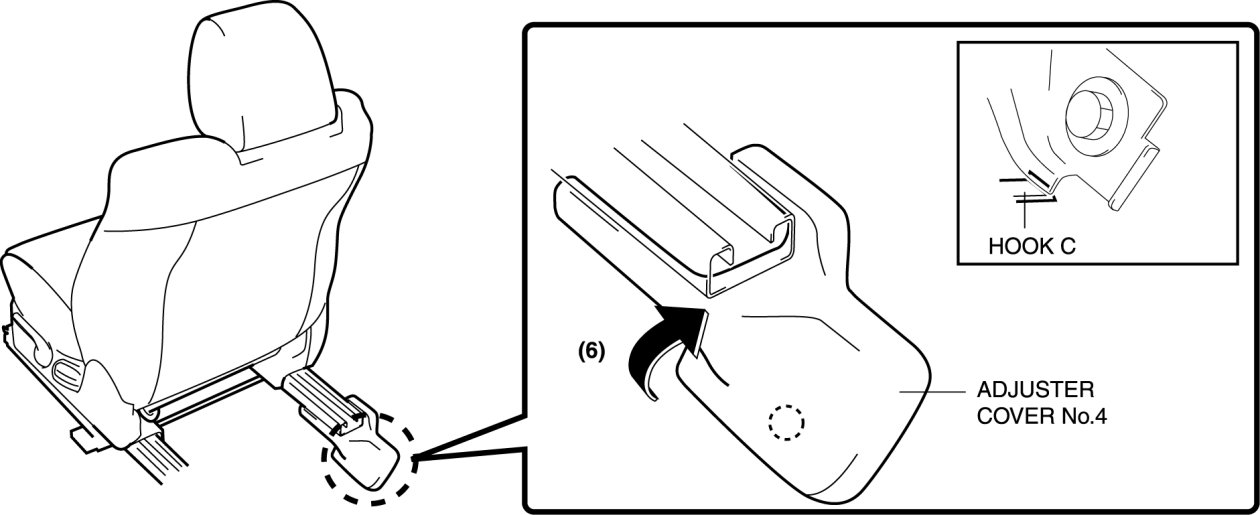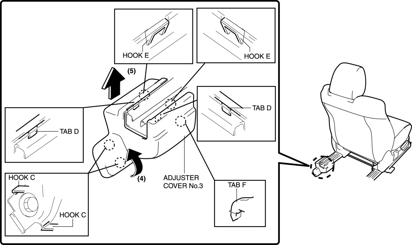 - When pulling the adjuster cover No.4, be careful not to damage the hooks and tabs.