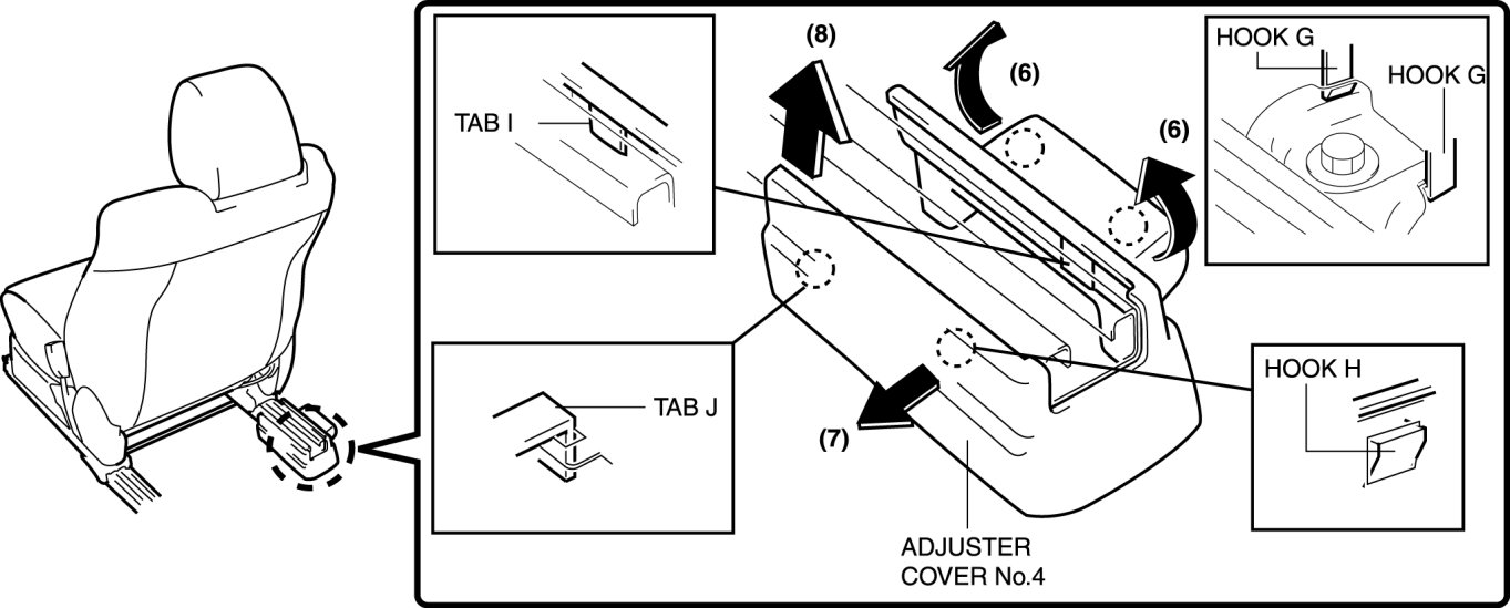 8. Detach hook G and H while pulling the adjuster cover No.4 in the direction of the arrow (6), (7) and remove it in the direction of arrow (8) shown in the figure, while remove the tab I and J.