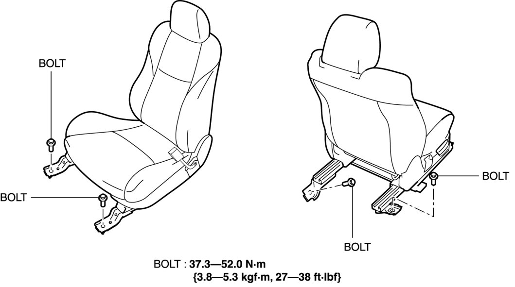 - After removing a front seat, do not operate the slider lever. If the slider lever is operated, the left and right slide positions will deviate, and the slide adjuster may be damaged after the front seat is installed.