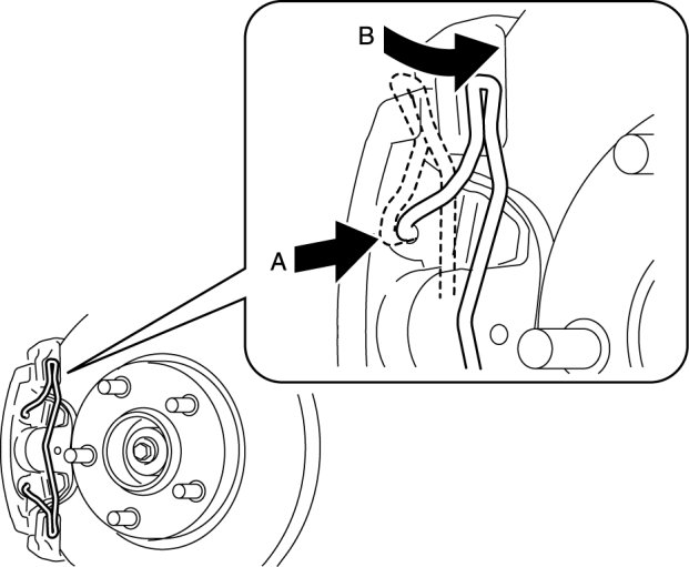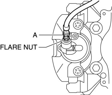 2. Tighten the flare nut while holding the brake hose at point A with a spanner or equivalent.