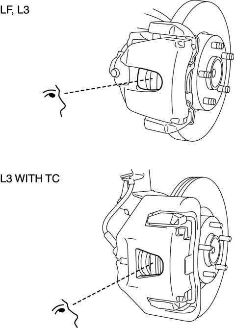 4. Replace the pads as a set (right and left wheels) if either one is at or less than the minimum thickness.