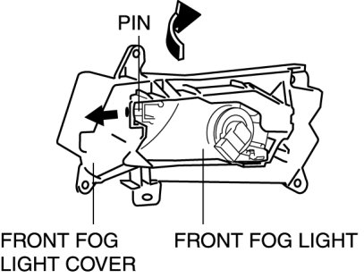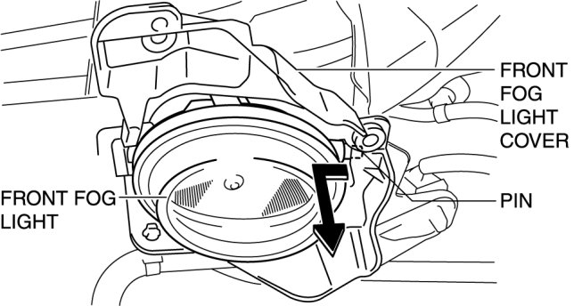 7. Pull the front fog light in the direction of the arrow shown in the figure and remove the pin from the front fog light cover.