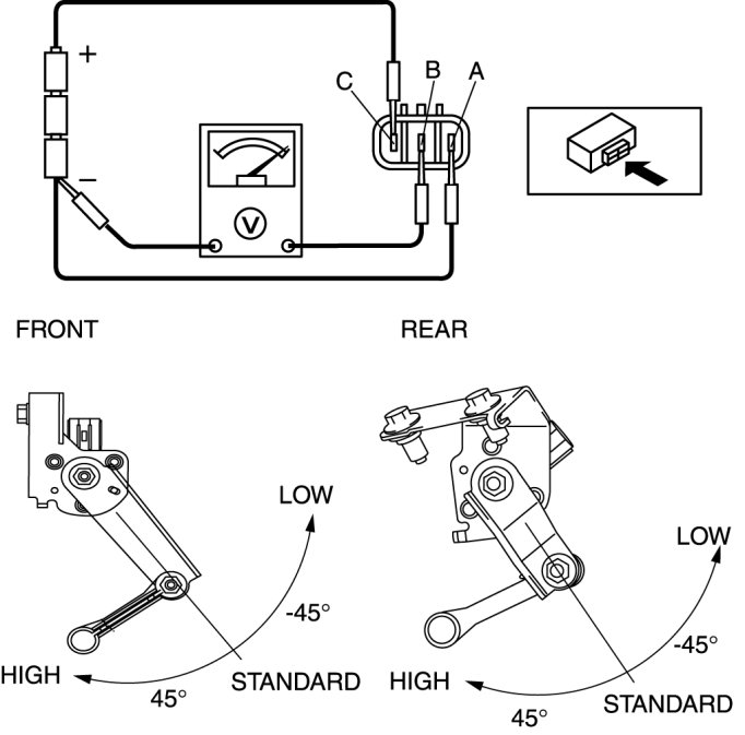 - If the voltage cannot be verified as indicated in the graph, replace the auto leveling sensor.
