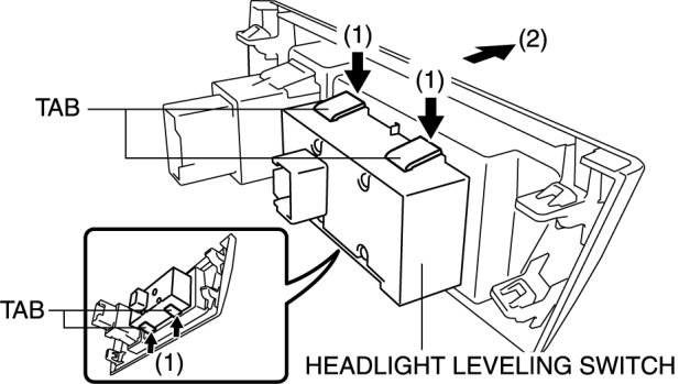 4. Remove the headlight leveling switch in the direction of the arrow (2) shown in the figure while pressing the tabs in the direction of the arrow (1).