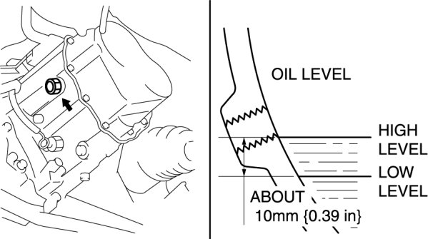 - If the oil level is lower than the low level, add the specified amount and type of oil through the oil level plug hole.