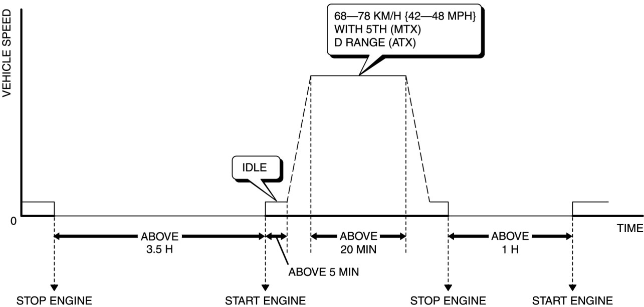 5. With the vehicle stopped, race the engine at the engine speed indicated, and then drive the vehicle as shown in the graph. The driving conditions before driving at constant speed are not specified. If possible, monitor RPM PID for engine speed during this procedure.